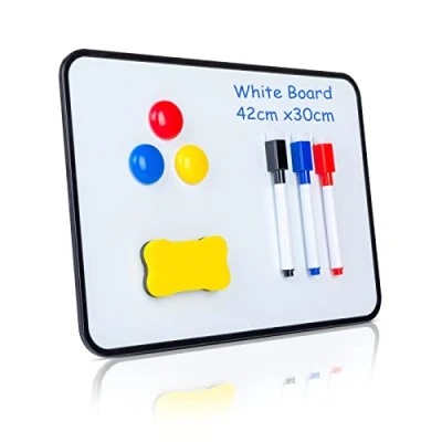 【PACKAGE INCLUDES】This Package Includes an A3 dry-erase Magnetic whiteboard and 3 Color Dry Erase pens with one Eraser and 3 Magnets. Each marker cap has felt eraser, which is easy for children to wipe away in seconds 【EASY TO CLEAN】Dry erase lapboard easy to write on and easy to wipe clean without stain. It’s made by high quality environmentally materials, lightweight and durable. Re-use, recycle and reduce paper waste. rounded corners design are safe to use without injury 【DOUBLE SIDED MAGNETIC DRY ERASE BOARD】Dry erase board has two sides, you can teach your kids or students to write and draw on the white board. 16.53 x 11.81 Inch Size, dry erase board is perfect size for kids to carry or handle. It's suitable for putting on the desk to writing and drawing 【MULTI-PURPOSE DRY ERASE BOARD】The Magnetic small whiteboard can be used as children's drawing, writing, bulletin board, calendar notepad, etc., suitable for all uses that executives, teachers, kids, students at either at home, work, classrooms, school or office.You can write some messages on it to remind you to do something 【100% EXCELLENT SERVICE】If you have any questions about our products, our professional after-sales team will provide you with satisfactory service, please feel free to contact us