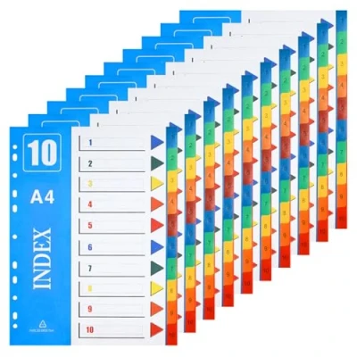 Efficient Design: The A4 file divider size is 8.86×11.81in and comes with a writable catalog page and with 10 distinguishable colored tag pages, you can write directories so the files are distinct, which helps to keep the notes organized, so you can quickly find the file Durable Material: The A4 folder dividers are made of high-quality PP plastic with a slightly textured surface, waterproof and durable, and not easy to deform and tear.Very suitable for daily study and work use Improve Efficiency: This A4 file divider is colorful, the design of the multi-color helps you divide different files and helps you quickly access the files you need while working, improving your work efficiency Multipurpose: With pre-punched 11-hole to fit most 2/3/4/11 ring binders, can be easily loaded into ring binders, great for notes, documents, contracts, recipes, and more, and very convenient for daily use Wide Application: Our A4 file divider are very suitable for, school, workplace, or home, whether it is an office worker or a student, they can help you classify and organize various files or job arrangements, getting the job done better and faster
