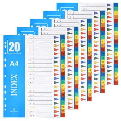 Efficient Design: The A4 file divider size is 8.86×11.81in and comes with a writable catalog page and with 20 distinguishable colored tag pages, you can write directories so the files are distinct, which helps to keep the notes organized, so you can quickly find the file Durable Material: The A4 folder dividers are made of high-quality PP plastic with a slightly textured surface, waterproof and durable, and not easy to deform and tear.Very suitable for daily study and work use Improve Efficiency: This A4 file divider is colorful, the design of the multi-color helps you divide different files and helps you quickly access the files you need while working, improving your work efficiency Multipurpose: With pre-punched 11-hole to fit most 2/3/4/11 ring binders, can be easily loaded into ring binders, great for notes, documents, contracts, recipes, and more, and very convenient for daily use Wide Application: Our A4 file divider are very suitable for, school, workplace, or home, whether it is an office worker or a student, they can help you classify and organize various files or job arrangements, getting the job done better and faster