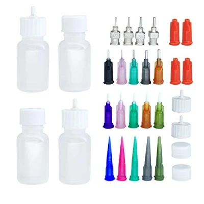 Package:16 Nozzles have different size from Big to Small Inner diameter: 0.41 mm to 1.20mm; 4 Bottle 30ml and 16 Nozzles different size and 4 Needle Nose Caps and 4 Flat Caps and 4 Plug Caps Material: Plastic and Stainless steel. 30ML Bottle can holds 1oz 30ml liquids,Each plastic tip bottles has clear measurement marks, which is convenient to control the usage of the liquids, make your diy craft work more accurate 16 Tips for wide range of applications and are easily replaceable Unlike other Bottles Easy squeeze Bottles for use with Jagua, paint, glue, silk dyes and more,Soft Squeeze Art Craft Applicator Dispensing Syringe Bottles for Jagua Ink Glue, Paste, Pain Product and size as shown in the picture