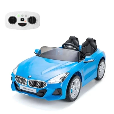 AmazonLUXURY BMW Z4 RIDE-ON: This twin-seat electric ride-on is a mini version of the sleek Z4 Roadster, reaching speeds of 3.6km/h and having reverse mode, its perfect for kids aged 3-7 PARENTAL REMOTE CONTROL: Equipped with a remote control, parents can easily take over the ride for safety, while adjustable seats and a seatbelt keep kids comfortable and secure – L128cm x W51cm x H76cm REALISTIC CAR FEATURES: Designed with signature BMW details like the iconic kidney grille, sculpted bonnet, tinted windscreen, and fully functional front lights, it delivers a real driving experience LONG LASTING POWER: The 12.8V lithium rechargeable battery gives up to 2 hours of fun on a single charge, with faster recharging, lighter weight and longer lifespan than standard batteries, so your little rider spends more time playing. BUILT-IN MUSIC SYSTEM: Kids can play their favourite songs on the go with the integrated MP3 player and aux input, adding a fun soundtrack to their adventures. Max user weight 30kg, Manufacturer: Wilton Bradley