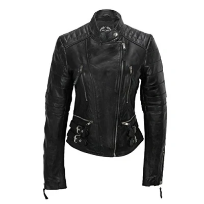 Slim Fit Consider buying one size up for good fit. Contoured panels for beautiful feminine shape. This jacket features a YKK zips throughout and metal hardware detail. Two cross zip pockets on waist and Two straight zip pockets on chest, Twin strap and buckle at lower waist. Slim Fit Pure Leather Jacket Slanted front zip closure, Zip on cuffs. Inside the jacket is fully lined and incorporates a leather lined pocket.