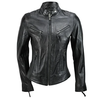 Xposed Ladies Womens Genuine Real Leather Vintage Slim Fit Red Brown Biker Jacket [5XL,Black]