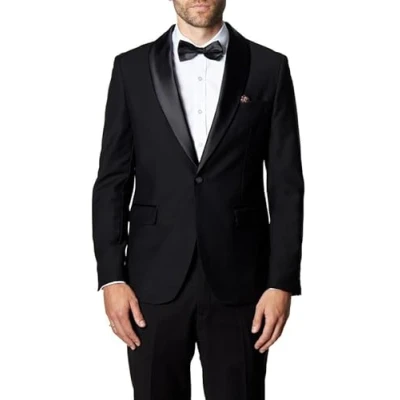 Classic evening tuxedo blazer in black with satin lapel from XPOSED London, Crafted from quality materials Tailored Fit, striking the perfect balance between Regular and a Slim fit (We recommend to take one size up) Features satin shawl lapels with satin trims on pocket, one button front, double vents in back This blazer is ready for any occasion, make a lasting impression! Perfect for weddings, formal events, and other special occasions To create a refined and elegant look with a black tuxedo jacket, pair it with a crisp white dress shirt, impeccably tailored black tuxedo trousers, and glossy black patent leather dress shoes. Choose between a black bow tie or necktie. Consider adding a black waistcoat for added formality. With confidence and attention to detail, this ensemble is a timeless choice for formal events, exuding sophistication and class.