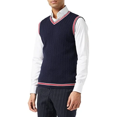 Xposed Mens Sleeveless V Neck Jumper Retro Cable Knitted Cricket Golf Sweater Jersey Top Vest[V961,XL,Navy Blue]