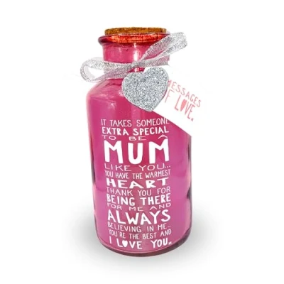 MESSAGE OF LOVE MUM - The Heart-warming Sentiment on the Jar Reads: It takes someone extra special to be MUM like you you have the warmest HEARTThank you for being there for me ALWAYS believing in meyou’re the best and I LOVE YOU. STRUCTURE A lovely, coloured glass jar with a cork stopper, requires a 2 x AA battery that can be placed anywhere around the home. This battery-powered LED jar will instantly add ambience to a room, such as a window, shelf, or anywhere else to add a relaxing glow. AN ULTIMATE GIFT This high-definition light-up jar is a precious and perfect gift for your mum who is close to your heart always. Gift this message of love to her and she will cherish this forever. This LED Jar is an ideal gift choice for a birthday, Christmas, anniversary, or just because. PREMIUM QUALITY Our sturdy jar is made up of high-quality glass. It contains an electric component and provides a range of heart-warming messages for your loved ones with long-lasting quality. The message of love features a wide array of incredible collections. Get yourself a one today! SAFETY INSTRUCTIONS Keep away from the children under 3. Keep away from fire as it contains electric component. Do not wash the jar. This is not a toy. Its just for decorative purpose only.