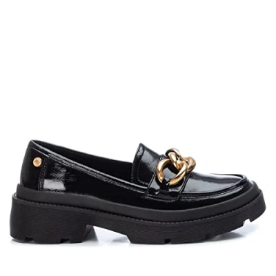 XTI Women's Loafer Made of patent leather Gold chunky chain detail on the front in trend this season. Thick non-slip rubber sole This model has obtained the vegan certificate by the world organization PETA (Animal Rights Organization) [Our Brand]:XTI is characterized by urban and functional fashion with footwear that combines the latest trends with comfort and versatility for an active, modern lifestyle.