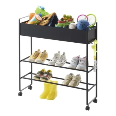 DIMENSIONS AND WEIGHT: This product is 8.66 x 29.33 x 29.33 inches (L x W x H) and weighs 12.13 pounds. [Versatile rolling entryway storage rack] This storage rack, which is perfect for entryways or garages, includes wheels, two tiers for shoes or sport balls, as well as compartments on its third tier. [Adjustable dividers] Change the position of the dividers to create compartments to match the size of whatever you need to store. [Can be used in many different ways] This sturdy and versatile rolling storage rack can be used as a shoe rack and general catch all in your entryway, for gardening goods, sporting goods, or a variety of hobbies. [Durable steel construction] The top basket can hold 11 lbs and ball storage compartment 4.4 lbs. Hooks are included for additional storage. COLLECTION: Our Tower collection features clean lines and modern designs available in black and white, enabling the line to fit seamlessly into any modern home. Most of our Tower line is made from steel and has a matte or textured finish. BRAND: Inspired by “small-space living” in Japan, Yamazaki creates truly unique, ultramodern products that are mindfully designed to make incremental improvements throughout the home and elevate quality of life. Yamazaki. Home, simplified.