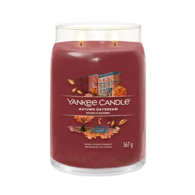 JoybuyThe Yankee Candle Signature Jar Autumn Daydream (567g) features a smooth soy wax blend with dual 100% natural fibre wicks, providing a fresh fragrance of clove, lavender, balsam, and eucalyptus woods, up to 80 hours of burn time, and comes in a decorative glass jar with a brushed tin lid.