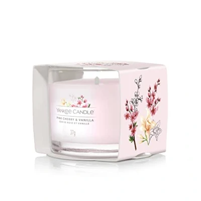 About This Fragrance A bowl of cherries. Scents of raspberries, and almonds, covered with fluffy pastel-pink clouds of vanilla cream. Glass Votive Candles Experience your favourite Yankee Candle fragrance in this, compact shape. Yankee Candle glass votive candles come in the same true-to-life fragrances, making them an easy way to try something new. Arrange several of the same fragrance together to add sparkle and scent to your mantel or table. Each glass votive candle comes in its own little package, so they are perfect for any occasion, too. Made from a natural soy wax blend. Burn Time 7 - 10 hours each.