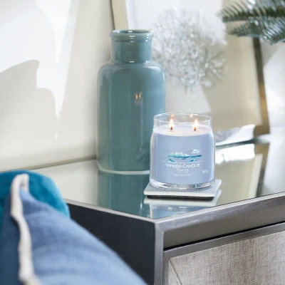 About This Fragrance Fresh, invigorating ocean air carried in by white capped waves - clean, sunny notes mingle with jasmine, white amber and sandalwood. Fragrance Notes: Blue Ozone, Linen Breeze, Bergamot, LemonCotton Flower, Muguet, White Lily, Fresh CloverSheer Musk, Fresh Vanilla, CedarwoodAbout Signature Medium Jar Candles Experience the Yankee Candle brand, totally reimagined. This refreshing take on the iconic Jar shape is designed to create the best experience to date. The two wick Medium Jar Candle is 368g and made with a premium soy wax blend. It perfectly enhances any moment at home on its own or as part of a beautiful candles cape. Hand-illustrated labels and vibrant wax colours are perfectly matched with the tried-and-true fragrances to create an inspired addition to your home. Burn time up to 50 hours. Height 11.4cm x Width 9.4cm.