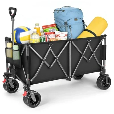 Innovative folding technology: easy and space-saving folding thanks to patented 4-way folding technology - the foldable handcart can be stored in no time at all. Ideal for travelling and at home. Large capacity: with 260 litres capacity and an amazing load capacity of 150 kg. Whether large shopping, camping equipment or garden utensils - this transport trolley can handle everything. Sturdy chassis: a robust steel frame with a unique double cross structure on the base ensures maximum stability. The handcart runs quietly and tilt-proof even under heavy loads. Manoeuvrable wheels: Equipped with 7 inch wide tyres and a 360° swivel wheel with parking brake for easy manoeuvrability and safe parking on a slope. The extendable handle (up to 102 cm) adapts to different body sizes and allows for comfortable pulling. Durable 600D Oxford fabric with storage compartments: The double-layer, waterproof and tear-resistant Oxford material ensures durability. With two front cup holders, internal mesh and elastic, reinforced mesh compartment (100 x 60 cm), everything stays organised and safely stowed away. A cleverly thought-out handcart foldable for order on the go.