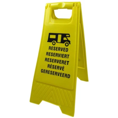 General description If you enjoy travelling in your motorhome, you probably know what it's like to have your pitch pinched! This bright yellow sign displays 5 languages to keep your pitch reserved all around Europe. The displayed languages are English, German, Danish, French, and Dutch. Manufactured from high-quality PP, the sign stands free and tall, and can be folded away for easy storage when not in use. Technical specifications Height: 60 CM Width: 25 CM Colour: Bright Yellow Product Code: SFZZSHMR