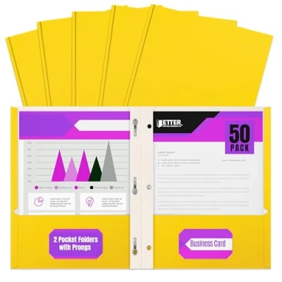 50-PACK: Yellow matte finish paper folders with 3.75" pockets and prongs. Easily holds 100 sheets (50/pocket) of letter size (8.5" x 11") paper/documents. But can even handle more. STURDY: Comes in a durable white box with color-coded label for easy identification; Bulk pack MULTI-USE: Can be used as a report cover for 3-hole punched paper and as a two-pocket folder BUSINESS USE: Two interior flat pockets each with die-cut business card slots VERSATILE: Great for school, home and office use