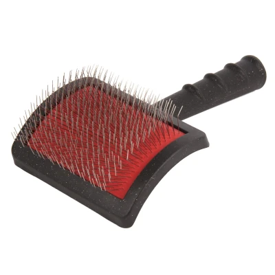 Yento Mega Pin Large Slicker Brush Show Tech+ Flex Groom Slicker brushes are specially designed to make brushing a lot easier, faster and painless for you and your pet. They are also really indispensable if you want to keep your pet’s coat healthy and natural! Thanks to the ergonomic, comfortable handle made from non-slip rubber and the flexible head, the brush head will follow the shape of your pet’s body. Therefore, a minimum of stress on hand and wrist is guaranteed and repetitive strain injuries are prevented. Another important feature is that this brush can be used on both sides, which makes it perfect for both left- and right-handed groomers. The brush pins ensure a good grip on the coat and loose and dead hair is collected in the brush pad. Time to say goodbye to mats, fur flying around and painful wrists! Use instructions Daily coat maintenance for bigger breeds with soft and fine coats and larger brushing areas. For small to medium-sized breeds or smaller brushing areas, we recommend the Show Tech+ Flex Groom Professional Slicker Single Soft. Gently brush and pull the brush towards the handle (don’t twist your wrist). Let the pins glide through the hair and repeat if necessary. Brush without putting downwards pressure on the skin. Long coats - Gently brush with a light, long stroke, brushing beyond the ends of the hair tip to avoid static and breakage. For the best result, brush the hair in layers. Start at the bottom by parting the coat horizontally and holding the unbrushed part up with your free hand. Work methodically upwards, keeping your wrist straight to avoid contact with the dog’s skin. Curly coats - Brush in the direction of the coat growth and then against it using light, long strokes. Wiry coats – Brush in the direction of the coat growth, then against it if necessary to remove mats and dead hair. If the coat is matted, use the Flex Groom Professional Slicker brush in combination with the Show Tech Mat Buster Dematting Comb. For dematting - Gently put the brush pins on the mat with a tapping movement and tease a few hairs from the mat by pulling the brush towards you and thus removing the pins away from the coat. Repeat until the mat is gone. To prevent mats and tangles, the dog’s coat should be regularly bathed, treated with a conditioner and brushed daily.