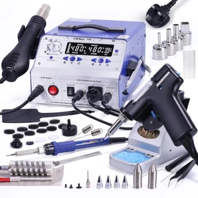 4-IN-1 – This unit integrates 4 rework tools in 1, a soldering station(75W Equivalent), a hot air station, a desoldering station, and a suction pen. You can use either the soldering iron or the desoldering gun when needed, and the hot air station can be used in conjunction with the suction pen for easy IC extraction. (The suction pen uses the built-in vacuum motor to help you extract chips that are too big for tweezers to grab) Temperature Control – Temperature setting is adjustable for the Desoldering Station (380~480°C), Soldering Station (200~480°C), and Hot Air Rework Station (100~480°C). All three stations come with temperature stabilization function that cycles every 20ms to keep the temperature steady when soldering, desoldering, or doing hot air SMD rework. Functions – The station comes with configurable functions including 6 preset memory channels (3 for soldering/desoldering, 3 for hot air station), Automatic/Manual Hot Air Modes, Sleep Mode (0~99 mins), Automatic Shutdown, Digital Temperature Calibration. Accessories Included – This soldering & desoldering kit includes the YIHUA 948-II 4-IN-1 rework station, 4 Desoldering Nozzles, 4 Suction Pen Nozzles, 2 Suction Pen Adaptors, 4 Hot Air Nozzles, ESD-Safe Tweezers, Cleaning Pins, 2 Rubber Retainers, 2 Heating Elements, 10 Filtration Adsorber, 2 Filter Springs, 2 Ceramic Filters, 1 IC Extractor, 1 heat-resistant pad. Choose YIHUA with Confidence: Rated for 230V AC with a Type-G UK power plug, this product comes with our 12-month UK-exclusive technical coverage. Our team provides professional technical support on Amazon 24/7. Questions and suggestions are welcome.