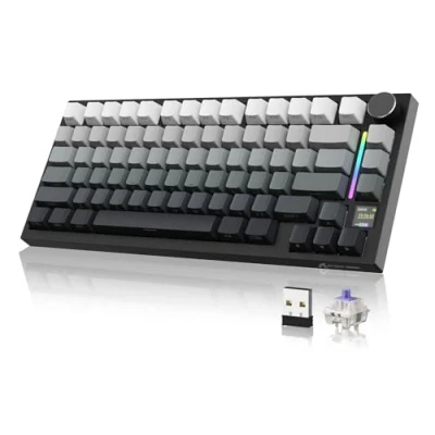 【75% ANSI Layout & Upgraded Gasket-Mount】Adopt the most popular 75% AINSI layout, making it practical choice for work/gaming. Fully equipped internal filling structure. Built-in 5 layers sound absorbing foams,including: PORON Sandwich Cotton, 8 × IXPE Switch Pad, PET Sound Absorbing Foam, Sponge Case Foam, Bottom Silicone Pad. Noise is maximally reduced, It achieve an ultimate soft, pure sound and smooth typing experience. 【Multi-Function TFT Smart Display & Knob Design】The gaming keyboard built-in smart TFT color display can intuitively display the keyboard status, including custom gif image,connection mode, WIN/MAC, battery,Lighting,volume. Built-in mechanical knobs allow quick adjustment of complex functions:volume adjust ,modes switch,screen control.Customize the screen and knobs to bring you more fun. 【Triple Connection Modes & Multi-Device Tasking】The X820Ultra supports Bluetooth or 2.4Ghz for wireless connectivity, or with the USB-C cable.With Bluetooth 5.1, the keyboard responses faster and save more power than the former Bluetooth versions.It is also easily switched among the three modes for efficient multitasking.Included 4000mAh battery ensures a long use. 【Hot-swappable & Single key Slotted Design】1.2mm PCB adopts leading ENIG technology. It supports 3/5-pin hot-swappable,with Linear pre-lubed blueberry switch,so you can enjoy the fun of making your own keyboard.Adopt single key slotted PCB design, improve key stability and input experience, accurately position and press the key, prevent the key bounce and mistouch,greatly improve the sensitivity and response speed of the keyboard. 【Programmable RGB & South-Facing LED】All the RGB lights built into the programmable mechanical keyboard are customized for you in south-facing design. With two-color injection molded PBT keycaps, soft RGB lights are output through the gaps in the keycaps.You can Use "FN+|" to switch between 22 modes default lighting. Those who like more DIY can also use compatible software to freely create their favorite effects. 【Support QMK & Compatible with Mac/Win】Programming in QMK Web Driver: https://qmk.top/. The custom keyboard support QMK web driver .The RGB mode, Key setting, Macro and Gif image display settings of the keyboard can be fully customizable. It is fully compatible with both Mac and Windows systems,ensuring that you can enjoy the full range of its features irrespective of your computing preferences., Platforms: Windows