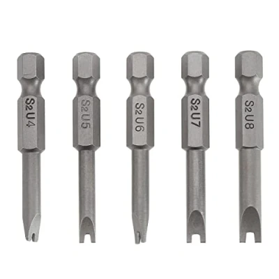 Material: The U-shaped drill bit is made of high-quality S2 alloy steel material , a high-hardness material commonly used in hardware , strong and durable . Size: U-Shape Magnetic Screwdriver Bit Set with 1/4 " Hex Shank , These bit is magnetic to hold securely on your screwdriver ,So you can use it safely and don't worry about them slipping off the screwdriver Multipurpose: Suitable for electric screwdrivers, manual screwdrivers, electric drills, air drills, etc. Useful for operating electronic equipment, very suitable for electricians, mechanical maintenance work Package Included: The set includes 5 different sizes of U-shaped heads, so it can meet different requirements.
