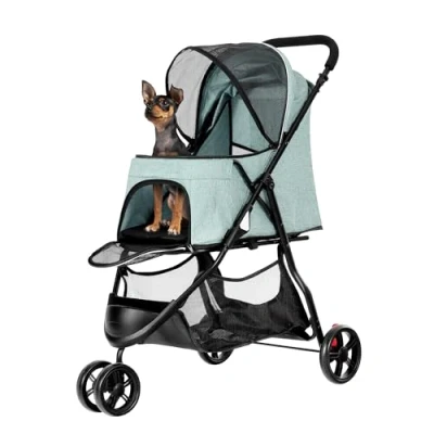 Provides your pet with a spacious and comfortable home: This dog stroller made of 300D Oxford fabric with breathable mesh windows provides your pet with a spacious and comfortable home. Our dog stroller ensures your pet feels safe and relaxed with a clear view. The enclosed mesh design protects your pet from external distractions and prevents them from escaping – for maximum safety. Sturdy and durable design: This cat stroller has a load capacity of up to 15 kg and is suitable for dogs, large cats, or multiple pets. The rust-resistant aluminum frame ensures lasting stability and reliability, making it the ideal choice for families with multiple pets or for traveling. Quick one-hand folding: The dog stroller can be easily folded and stored with one hand to save space. It fits easily into the trunk or small spaces at home, making it ideal for travel, outings, or everyday use. Large Storage Basket: This pet stroller features a sturdy storage basket for essentials like snacks, or water bottles, making every outing more convenient. It's designed to allow even elderly, injured, or disabled pets to enjoy the outdoors without worry Smooth and Stable Mobility: This foldable pet stroller features shock-absorbing EVA foam wheels for optimal maneuverability on surfaces like grass, sidewalks, and sand