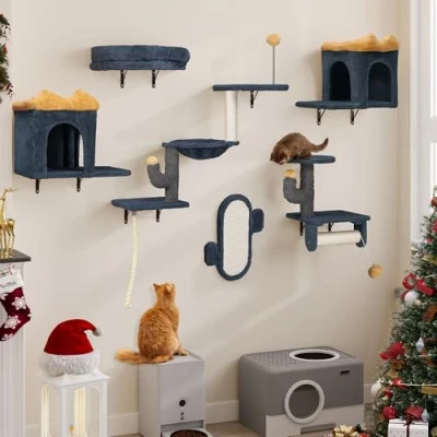 Ideal Cat House: Featuring 2 cozy cat houses and an additional cat bed, this cat tree provides multiple options for resting and sleeping, accommodating more than one cat or offering a variety of resting spots for a single cat Solid Structure & Plush Fabric: Each component of the cat wall mounted furniture is constructed from high-quality particle board for its stability; The plush fabric offers a velvety surface that cats love to snuggle into, making it a soothing spot for relaxation Fit Scratching Needs: The cat tree for indoor large cats includes a wall-mounted scratcher for your cat to scale and explore vertically; The hammock provides your cat with ultimate comfort while sleeping Sleek & Practical: Our cat tree for indoor large cats features a cactus design with two soft fur hanging balls, offering a stylish appearance while providing your cat with play options Space-Saving Design: The hanging cat climbing tree maximizes vertical space, conserving valuable floor area while promoting mobility for your feline friend to rest, play, and exercise