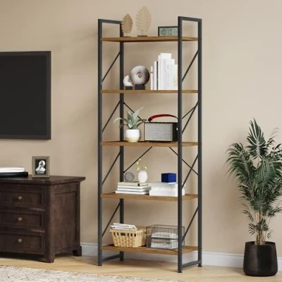 ARTSY MODERN DESIGN - Streamlined minimalism meets rustic industrial in this chic bookcase. Its elegant look and simple structure makes it a fashionable and functional fit in any room VERSATILE OPEN 5 SHELVES - Open shelves and stable structure provide enough storage space, allowing you to show off your displays in every direction. Suitable for organizing books, family photos, potted plants, CDs, ornaments, and more DURABLE & STURDY - Crafted with wrought iron in a matte black finish, and constructed from sturdy boards and black coated metal frame. Uniquely designed metal sidebars with X-shaped rod in the back provides constant stability ANTI-TIP KITS & EASY ASSEMBLY - Please remember to install the anti-tilting tool on the wall for better stability and less unexpected injuries. All necessary accessories, tools, and illustrated instruction will be packed. You can finish the whole installation effortlessly and quickly EASY AND FUNCTIONAL USE - This modern, functional bookshelf takes up limited space. Stylish yet sturdy, this home book shelf is the addition to your living room, study room, bedroom, and office