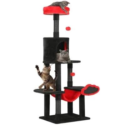 Multi-level Playground: Whether your cat loves perching high, hiding low, or swaying in a hammock, this cat climbing tree delivers. The clever layout satisfies their climbing instincts while offering private nooks and cozy lounging zones Built-In Scratch Heaven & Dangling Balls: Designed forhabits, this cat tower features sisal-wrapped posts and a scratchable cloud board. Two dangling plush balls stimulate play, helping reduce boredom and keep your cat mentally engaged Secure Build with Stable Foundation: Crafted with a thick engineered wood and a wide base, this cat tower stays steady, even during active play. Quick assembly makes setup easy for cat owners of all experience levels Striking Red & Black Statement: Turn your cat's furniture into a home accent, this bold modern cat tree blends luxury velvet in classic black with bright red highlights, making it an ideal fit for stylish apartments and homes Velvet-soft Touch: Wrapped in ultra-soft velvet fabric, every level pampers your cat with warmth and comfort. Whether resting in the hideaway or stretching on the top perch, it's a cozy retreat from base to top