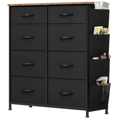 YITAHOME Chest of Drawers, Dresser with side pockets & hooks, Fabric 8 Drawers Handles, Metal Frame, Wood Top, for Bedroom,Living Room,Nursery Room,Hallway, Black