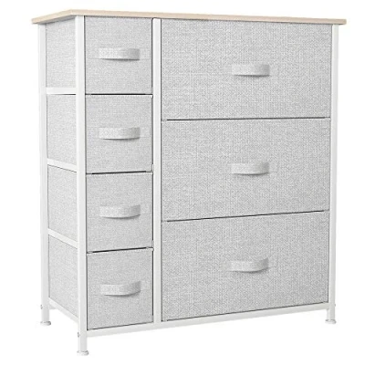 QUALITY CONSTRUCTION- Made of reliable metal frame and durable MDF wooden top; 7 removable and foldable drawers; Easy pull fabric handles help conveniently open and close the drawers; 4 adjustable plastic feet help protect your floor from scratches DURABLE FABRIC- All the outer sides and inner sides are made of high quality breathable non-woven synthetic fabric; Easy Care- wipe clean with a damp cloth and allow to air dry EASY TO ASSEMBLE- Detailed instructions and installation video will guide you through a hassle-free installation process, and hardware is included in the package so only fastening some screws will take energy UNIVERSAL MATCH- Premium light grey fabric drawers, sturdy white metal frame and waterproof wooden tabletop give the storage organizer a modern style. This unit easily fits in various living spaces: living rooms, bedrooms, hallways, entryways, closets and nurseries, etc. HIGH CAPACITY- 7 drawers of different sizes provide more storage choices, and sufficient space creates a neat and clean space for your bedroom or living room. Overall dimensions: 64 x 30 x 72 cm (L x W x H).Drawer dimensions: 40 x 28 x 22 cm (L x W x H) / 15 x 28 x 16 cm (L x W x H)
