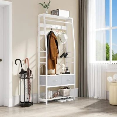 YITAHOME Coat Rack, 6 in 1 Hall Tree with 2 Drawers Floorstanding Stand Shoe Storage Wood and Matel Clothes Rail 8 Hooks, for Hallway Living Room Entryway Bedroom, White