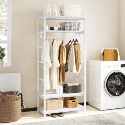 YITAHOME Coat Rack, Tall Hall Tree, Industrial Rack Stand with 4 Shelves, Floorstanding Clothes Rail Shoe Storage, Garment for Hallway, Living Room, White