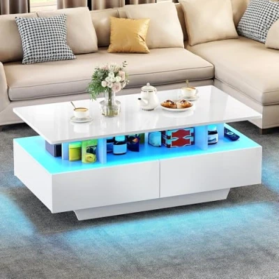 LED COFFEE TABLES: Set the mood by adjusting 16 captivating colors, 4 dynamic modes, and brightness via remote control of coffee table. From cozy evenings to vibrant gatherings, this modern LED coffee table has you covered FASHIONABLE HIGH GLOSS FINISH: The white high gloss coffee table instantly brightens up your living room. Its polished surface not only looks stylish, but is also easy to clean and maintain, making it good for modern and traditional decor. 4 DRAWER STORAGE SPACE: The tea tables for living room with 4 drawers comes with built-in storage shelves, good for storing remote controls, magazines, snacks, and other essentials and small items. RGB LED STRIP LIGHTS: Set the mood by adjusting 16 captivating colors, 4 dynamic modes, and brightness via remote control of coffee table. From cozy evenings to vibrant gatherings, this modern LED coffee table has you covered. STURDY STRUCTURE, SMOOTH DRAWERS: 55D x 90W x 41.1H cm, whether you have a spacious living room area or a smaller space, the dimensions of this coffee table are ideal. Made of top-quality particle board, this storage coffee table is sturdy. In addition, the drawers are sturdy, slide smoothly, and operate quietly.