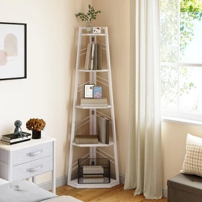 YITAHOME Corner Shelf, 5 Tier Ladder Industrial Bookshelf, Floorstanding Shelving Unit, Wooden Open Bookcase for Living Room, Hallway, Bedroom, Home Office, Pure White Bookshelves