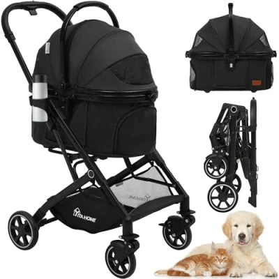 YITAHOME Dog Pushchair, Pet Stroller 3 in 1, One Click Foldable Cat Stroller, Pram with Detachable Carrier Storage Basket Cup Holder, Car Seat, Buggy (Black)