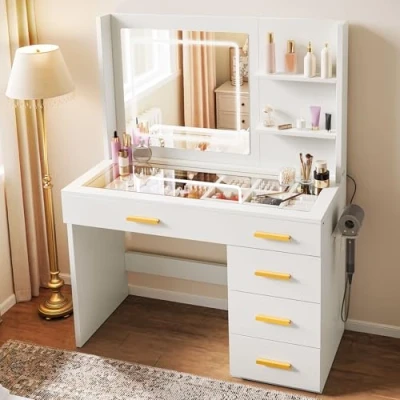 Large LED Mirror with Adjustable Height: Features a spacious 60×55 cm mirror with a built-in LED strip offering 3 color modes and adjustable brightness. The even illumination highlights facial details, ideal for precise makeup and skincare routines Wide Tempered Glass Vanity Tabletop: The 100×40 cm makeup desk tabletop provides ample space for daily essentials, while the crystal-clear tempered glass top lets you easily view stored items beneath, combining durability with a modern touch Plenty of Room: Keep your makeup vanity no-clutter with a wide top drawer with dividers, three deep side drawers, and open shelves. Store makeup, brushes, and accessories neatly for a more organized, elegant dressing area Smart Power Hub & Hair Dryer Holder: No more searching for outlets or dealing with tangled cords. With 2 AC outlets, 2 USB ports, and a built-in hair dryer holder, your devices and beauty tools are always powered, accessible, and ready to use Sturdy Build & Easy Assembly: Made from durable engineered wood with an elegant white hemp finish, this vanity desk with mirror and drawers offers strength and charm. It includes a non-tipping kit for security and clear instructions for quick setup