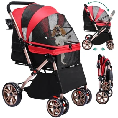 YITAHOME Foldable Dog Stroller for Small Dogs, Pet Buggy with Reversible Handle, Mesh Windows, Cup Holder, 360 Rotating EVA Wheels Brakes (Red)