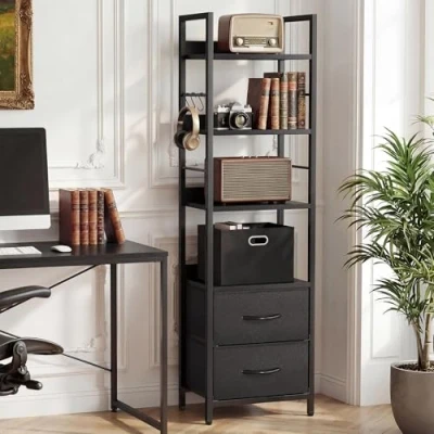 Compact Corner Storage Solution: Measuring 40 x 30 x 146 cm, this industrial bookshelf is ideal for making the most of vertical space in small areas such as corners, hallways, study rooms, apartments, dorms, or offices, without taking up valuable floor area Open & Concealed Storage: This freestanding bookshelf merges 4-tier adjustable open shelves for displaying books and decor, with two soft fabric drawers below; The 2-in-1 design expertly conceals visual clutter and showcases items to keep your space tidy Any-Room, Any-Use Design: Maximise home organisation with a single versatile piece; This bookcase works beautifully as a stylish display in the living room, a functional bookshelf in the bedroom, or essential storage for the kitchen, office, and bathroom Industrial Flair & Sturdy Build: The black bookshelf's black wood-grain finish paired with sleek black steel creates a bold industrial look that blends easily with any decor; Its robust construction and adjustable feet ensure lasting durability and stability Easy Setup & Safety: Setting up this 4-tier bookshelf is simplified with detailed instructions and numbered parts; The included anti-tip kit ensures safe family use, complemented by four convenient side hooks for hanging essentials like keys, bags, or towels