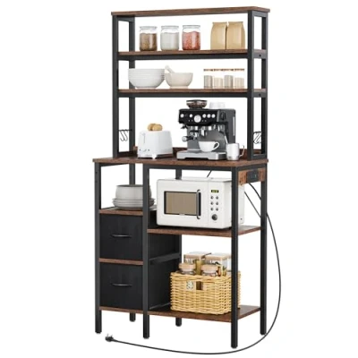 Built-in Power Station: The baker’s rack storage unit includes a built-in power strip with 2 AC outlets and 2 USB ports, allowing you to power multiple appliances like your microwave and coffee maker simultaneously. This kitchen shelves features integrated leakage protection for enhanced safety, while its hidden cord design helps maintain a clean, organized look in your kitchen or coffee corner. Flexible kitchen storage & organisation: Featuring adjustable shelves and multiple tiers, the coffee station easily accommodates items of various sizes. With 4 hooks and 2 fabric drawers, plus a spacious kitchen worktop, this kitchen shelf not only stores kitchen appliances but also serves perfectly as a functional coffee or bar station or kitchen island, maximizing both storage and utility. Sturdy & Stable Structure: Constructed with a robust steel frame and durable particleboard, the kitchen unit provides reliable support for heavy kitchen essentials. This kitchen rack includes anti-tip devices, non-scratch adjustable feet, and reinforced bracing to ensure steady placement and safe, long-lasting use on various floor surfaces. Multi-Scene Versatility: Measuring 31.5 x 15.7 x 66 inches, the kitchen sideboard fits perfectly in kitchens, living rooms, or offices. Thanks to its compact size and rustic industrial design, this microwave shelf stand can function as a coffee bar, display shelf, or mini pantry, adapting seamlessly to your changing storage and decor needs. Easy Assembly & Support: The kitchen pantry cupboard comes with numbered parts, clear instructions, and all necessary tools for straightforward setup. Adjustable shelves and feet on this kitchen shelf unit allow for customization, while dedicated customer support ensures assistance is always available, making your experience smooth and satisfying from start to finish.