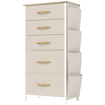 YITAHOME Narrow Chest of Drawers with 5 Drawers, Fabric Side Pocket&Hooks,Easy Pull Handle,Sturdy Steel Frame,Storage for Bedroom, Kids Room, Closet, Clothes,Beige