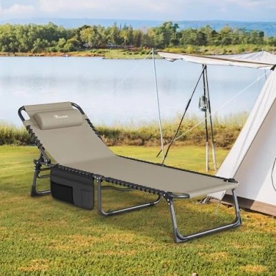 YITAHOME Reclining Sun Lounger 190x60x31 cm Folding Bed 4 Position Adjustable, Sunloungers with Removable Headrest & Side Pocket Load capacity 300lbs for Garden, Beach, Poolside, Camping, Khaki