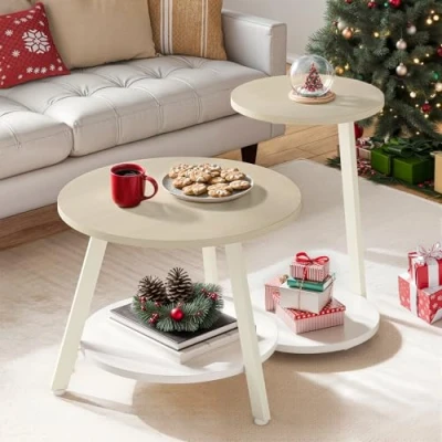 YITAHOME Round Coffee Tables, Set of 2 Nesting Tables with Storage Space and Unified Style Design, Small for Living Room, Side Table Sofa Bedroom, Oak White