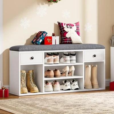 Ample Storage Space: Featuring compartments of different sizes, this shoe storage bench accommodates various shoe types, making it a versatile shoe cupboard and hallway storage solution. The three open cubbies of this shoe rack hold up to 8 pairs of sneakers or sandals, while the left and right compartment fits 2 pair of middle boots, offering exceptional shoe storage. Comfortable Seating: Topped with a plush 28D sponge cushion, our shoe bench offers a comfy bench seat to relax without collapsing over time. Sized at 105W×30D×50H cm, this storage bench indoor fits seamlessly in your hallway as a hallway bench, at the end of a bed, in a dressing room, or living room, providing both shoe storage with seat and a relaxing perch. Practical Fabric Drawer with Handle: Store essentials like keys, sunglasses, and purses in the easily accessible fabric drawer of this hallway storage unit. Quickly open it for convenient access or remove it for thorough cleaning, keeping all your handy items in place and ready for use, adding to the functionality of your storage benches. Modern Shoe Organizer: Crafted from solid engineered wood, our shoe bench is designed for daily use. Its classic white and gray color scheme and sleek design complement various home decors, bringing tidiness and order to your space. Easy Assembly: Details matter when it comes to furniture. Pre-installed foot pads protect your floors from scratches. With clear, step-by-step instructions, assembly for this shoe storage with seat is quick and easy, so you can start enjoying your new shoe bench storage with seat in no time.