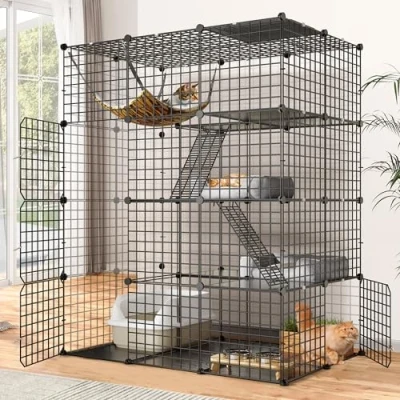 Enhanced Stability: Secure your cat's playpen with included cable ties and connectors for lasting firmness Spacious & Convenient: With dimensions of 104 x 72 x 140cm, this roomy catio is ideal for 1-3 cats to play and relax; Features 3 front doors and a skylight for convenient access Cozy Hammock: Get extra fun for your furry friends with the spacious, plush hammock included; This cat enclosure is also suitable for small pets like rabbits and squirrels Pet Play Paradise: Soft yet sturdy platforms protect paws, while hook-top stairs create exciting play areas, ensuring an optimal play haven for your pets Application and Assembly: The cat playpen is designed for both indoor and outdoor settings-bedrooms, living rooms, cat yards, or travel RVs; Quick assembly in 10-25 minutes for an enriching pet experience