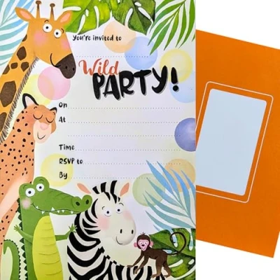 🦓 20 JUNGLE SAFARI PARTY INVITES – Set the scene for an unforgettable wild party with these fun and vibrant jungle-themed invitations, featuring adorable safari animals like giraffes, zebras, monkeys, leopards, and crocodiles. 📏 PERFECT SIZE & HIGH-QUALITY – Each invitation measures 19 x 13.5 cm, offering plenty of space to write party details while being easy for little hands to hold. 📩 COMPLETE SET WITH ENVELOPES – Includes 20 invitations and 20 orange envelopes, making it easy to send out your invites in style. ✍️ PERSONALISED FILL-IN STYLE – With dedicated spaces to write your party details, these invitations add a personal touch and make planning your event simple. 🎉 IDEAL FOR VARIOUS EVENTS – Perfect for kids' birthday parties, school events, classmates, baby showers, and safari-themed celebrations.