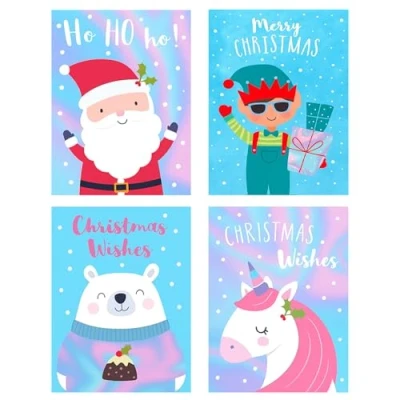 🎄 32 MINI CHRISTMAS CARDS – A fun festive pack of mini Christmas cards designed especially for children to share with school friends, classmates and teachers. ✨ 4 CUTE FESTIVE DESIGNS – Includes Santa, Elf, Polar Bear & Unicorn – bright, cheerful and loved by kids of all ages. ✉️ ENVELOPES INCLUDED – Each card comes with a matching white envelope, ready for children to fill out and hand out at school. 🖊️ INSIDE MESSAGE – Each card reads “Merry Christmas” inside, leaving space for kids to add their own name or short note. 📏 SMALL & SWEET – Compact 8.5 x 6 cm size – perfect for little hands and classroom exchanges. Designed in the UK by YLAB – You Love a Bargain.
