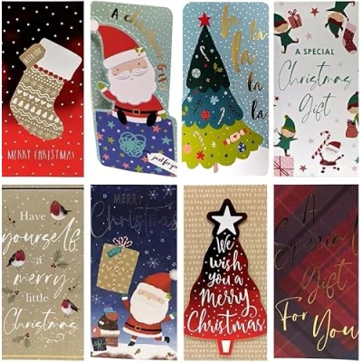 🎄 8 Festive Christmas Money Wallets – This premium pack includes 8 beautifully illustrated Christmas wallets, each with a unique seasonal design including Santa Claus, Christmas trees, stockings, and more. 💌 Matching Red Envelopes Included – Each wallet is paired with a vibrant red envelope, making your gift presentation extra special and festive. 🎁 Perfect for Cash, Gift Cards & Vouchers – Designed with handy slits inside to securely hold banknotes, gift vouchers or cards, making them ideal for personal or professional gifting. 🖊️ Printed Festive Greeting Inside – Each wallet includes a cheerful message: To... Merry Christmas From... – ready to personalise with your name and recipient. 📏 Ideal Size & Premium Quality – Wallets measure 16 x 9 cm, made from sturdy card with quality finishes to make your gifts feel thoughtful and luxurious.