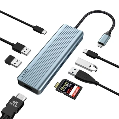 Extreme Expansion 9-in-1 Docking Station - USB C Adapter with 3 USB-A Ports (Fast Data Transfer,Connection of Mouse, Keyboard and Other Devices) 4K HDMI Ultra HD 3D video, game projection or PPT to HD TV, monitor or projector. 100 PD fast charging (as fast as original charger) SD/TF card slot supports capacity up to 512GB. Full HD 4K HDMI to USB C Dongle - Mirror or extend your Type-C device's screen with 4K video at 30Hz HDMI output to HDTV, monitors or projectors. Perfect for your game or movie night, online classes or meetings! SUPER FAST DATA TRANSFER AND READ: Support USB-C power delivery to enable high-speed charging for your laptop up to 100W. This MacBook Pro USB adapter allows you to connect hard drives, flash drives, printers, projectors, mice and other USB devices. devices to your MacBook Pro and transfer data at up to 5Gbps/s. Supports SD/TF e 2 x Type A2.0: the USB-C hub supports the lettore di schede SD/Micro SD USB 2.0, thin SDXC schede a 2 TB, velocità di trasferimento dati SDR25 104 MB/dry. (Multi-LUN). 2 porte di tipo A 2.0 ti aiutano a collegare tastiera e mouse al tuo laptop. Plug and Play - Strong Cooling - The USB C Hub can be used directly without drivers, programs or software. The company's high-level intelligent chip and various protection systems to prevent over-current, over-voltage, short-circuit and high temperature ensure the safety of file transmission and storage.