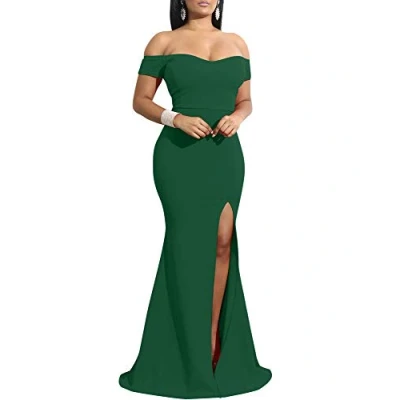 YMDUCH Women's Off Shoulder High Split Long Formal Party Dress Evening Gown, DarkGreen, XXL