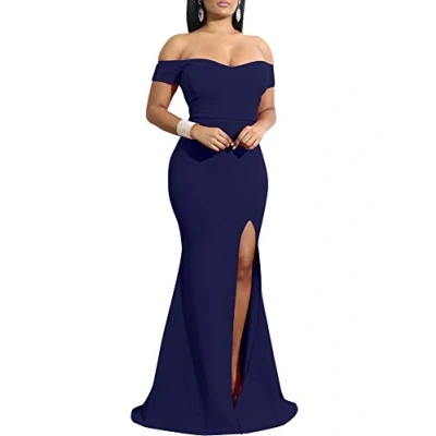 YMDUCH Women's Off Shoulder High Split Long Formal Party Dress Evening Gown, Navy, S