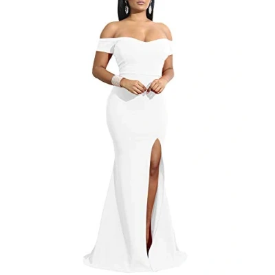 YMDUCH Women's Off Shoulder High Split Long Formal Party Dress Evening Gown, White, XL