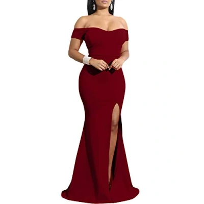 YMDUCH Women's Off Shoulder High Split Long Formal Party Dress Evening Gown, WineRed, S